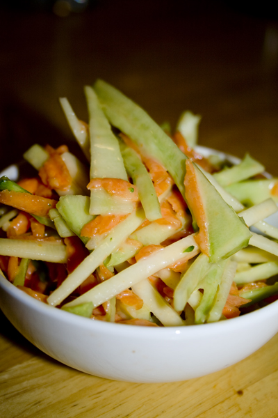So, I bought some broccoli (I was getting it anyway for dinner veggies) and a couple of carrots. This week as I’ve made broccoli as a side, I’ve just used the florets (bushy part on top) and saved the stems for slicing. Tonight was leftover night and I whipped up a delicious slaw to go with the variety of foods.