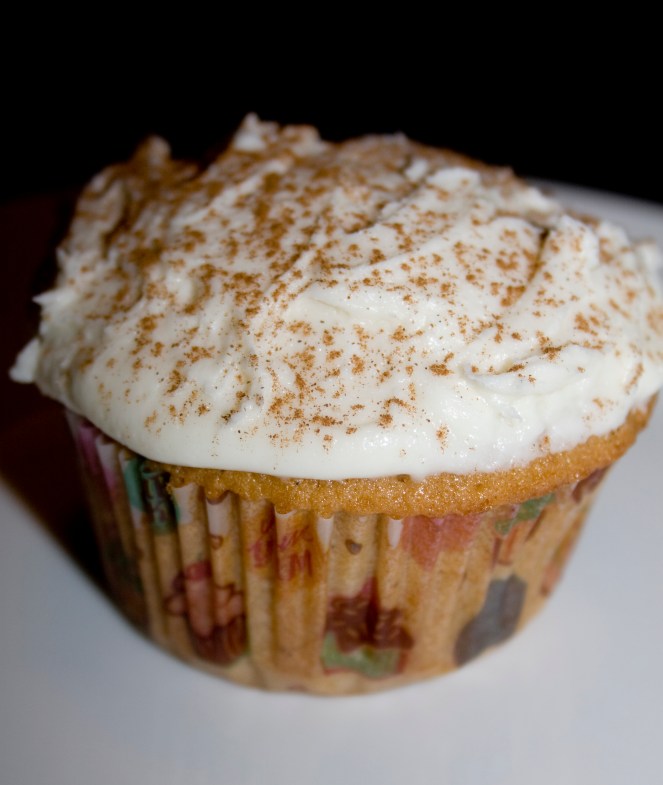 Yesterday, I spent the day at the hospital. It was a very long day. In the morning, my pastor and his wife came down to pray with my Poppa before surgery and to be of tremendous comfort to me. Pastor Phil offered to buy me a coffee, but since I don’t drink it, I declined. Then he offered a chai latte – something I’ve never had, but know is what Phil drinks. My sister happened to have just purchased one and was standing next to me with her aromatic steaming cup in hand. As I took a sip, I realized Leslie’s (Phil’s wife) description was perfect – “like Christmas in a cup” she’d called it. It was really amazingly good. Filled with holiday spices. Mmmmm. Since I have been diagnosed with addictive food disorder (I totally just made that up), I still didn’t take Phil up on his offer. The last thing I need it to become hopelessly in love with a calorie laden beverage. However, it reminded me of a cupcake I’d seen in one of my cookbooks. Chai Latte Cupcakes. I’ve adapted the recipe, made some tweaks and have come up with what I’m going to call (love you Leslie for giving me this name) “Christmas in a Cupcake”. Today was the perfect day to try them out – because it’s Pastor Phil’s birthday! 🙂