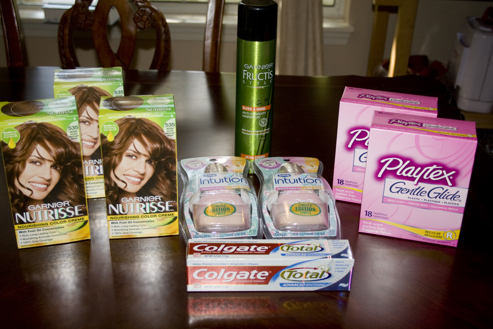 I used several coupons from my newspapers ($3 off each of the hair color, $1 off the hairspray) and printed others ($2 each box of tampons and Facebook gave me coupons for $4 off each of the razors…and they were buy-one-get-one-free). You can see all the scenarios at my fav couponing site – www.fabulesslyfrugal.com