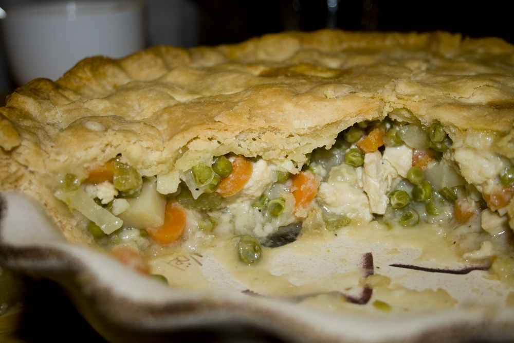 - Roll out pie dough and place in deep dish pie plate. Pre-cook for 7 minutes. Pour the chicken mixture into warm bottom pie crust – scooping in chicken/veggies first and pouring broth over until pie dish is full. Cover with top crust, seal edges, and cut away excess dough. Make several small slits in the top to allow steam to escape.