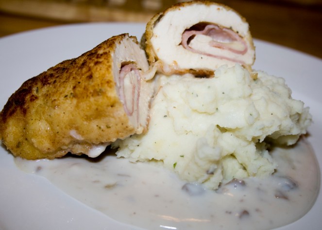 I’ve never tried Chicken Cordon Bleu before, and thought I’d give it a whirl tonight. Traditionally, Cordon Bleu has swiss and ham rolled in flattened chicken breasts. I’m not a big fan of swiss, but figured a little Dijon mustard paired with mozzarella inside would give it that traditional kick. I served this over a quick mushroom gravy with mashed potatoes and veggies. It turned out fabulous!