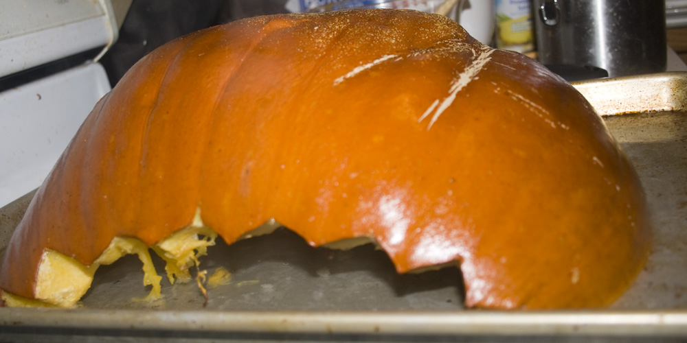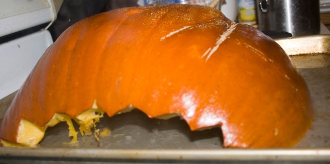 1. Cut the pumpkin in half and discard the stem section and stringy pulp. I just use my carved jack-o-lantern pumpkins…must do this within about 24 hours of carving though.