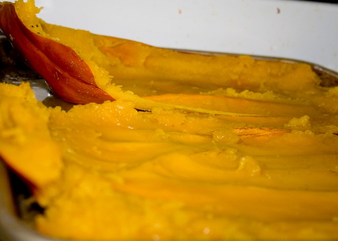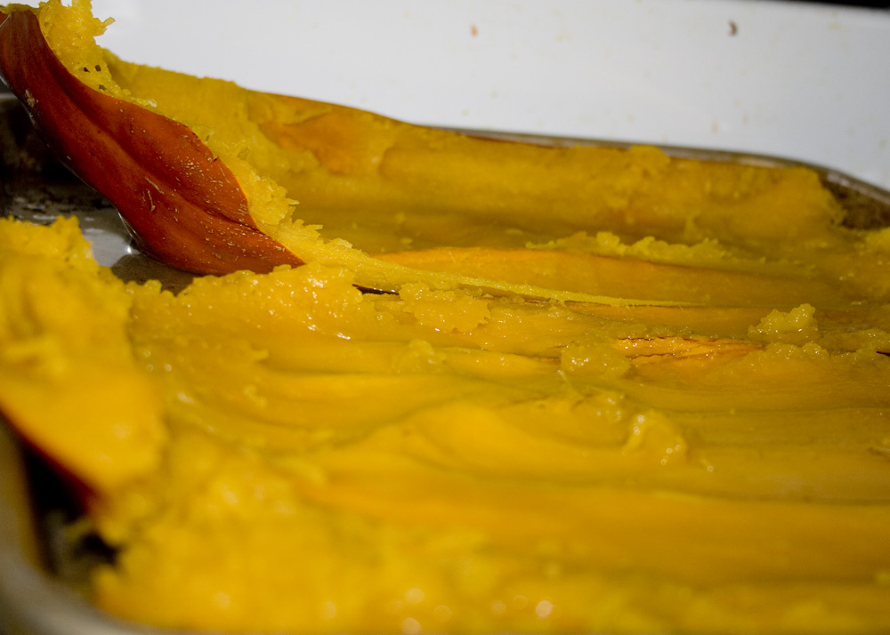 4. Once the baked pumpkin has cooled, use a spoon to gently lift and scoop the cooked pumpkin out of the skin. It should separate easily and in fairly large chunks, if the pumpkin is cooked right. Then simply puree or mash it – I use my food processor.