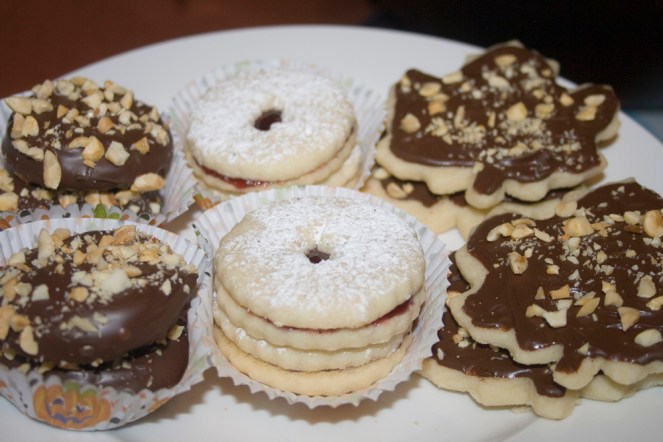 I love versatile recipes. This one I got from my cousin’s blog – care of the Barefoot Contessa. Today, I made it into three different cookies. Part of it I turned into Emilys. Others into Raspberry Linzers and then just cut out some pretty leaf shapes and did a little chocolate and roasted peanut action on top of the rest.
