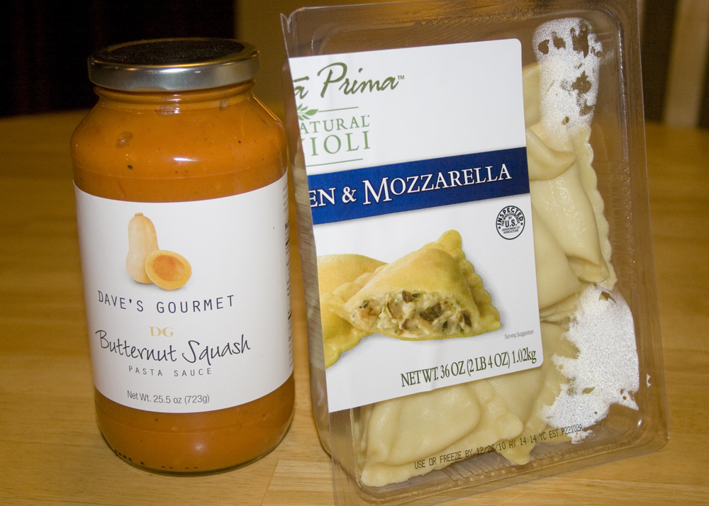 Oh goodness was it good. I’ve had the ravioli before, usually I just drizzle it with some olive oil and a sprinkle of parmesan cheese and call it good. The butternut sauce was absolutely delicious with it though. Yum yum yum. And, it’s super light. The ingredients are: butternut squash, water, tomato paste, red bell pepper, evaporated cane juice, butter, celery, onion, garlic, seasoned salt, citric acid and black pepper. Seriously. All real ingredients, and only 100 calories in a serving. Boil up some water, cook the ravioli (about 3 minutes), swoosh it around with some sauce and bam – a totally brainless, but still delicious dinner.