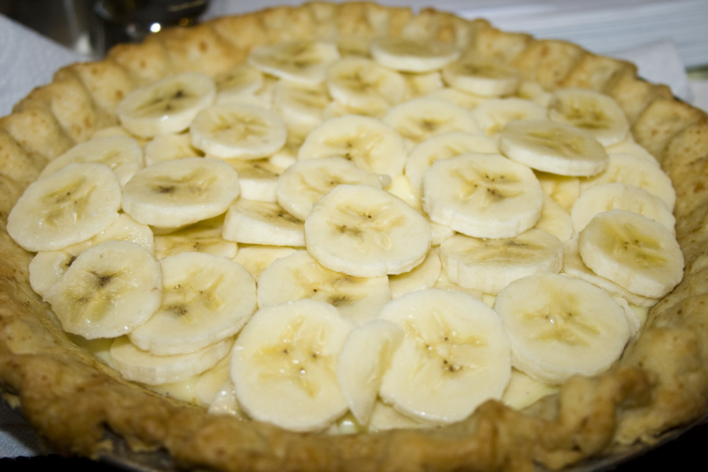 2.  Discard the vanilla bean and pour half the warm filling into the baked and cooled crust.  Add a layer of 2 ripe bananas, sliced thin, then pour remaining filling over bananas. Lay a sheet of plastic wrap directly on the surface of the filling and refrigerate the pie until the filling is chilled and set, about 4 hours.
