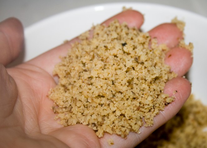 These cookies have many names. People call them Mexican Wedding Cakes, Italian Butter Nut, Southern Pecan Butterballs, Snowdrops, Viennese Sugar Balls and Snowballs. They are pretty much the same thing. Nuts and butter…with a little sugar and flour to hold them together. You can make these delights with any nut you like, I prefer the slightly bitter walnuts as an offset to the richness of the butter and sweetness of the sugar. Whatever nut you use,  the key is to grind up the nuts as finely as possible. The bigger your nut chunks, the harder it will be to get the dough to hold together. Pulse them in the food processor until they are about the size of couscous. Maybe just a wee-bit smaller. Like this:
