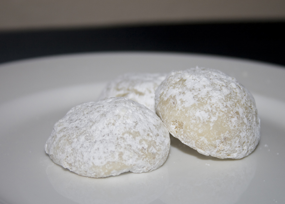 Chopping the nuts that fine will enable the dough to blend together nicely and form good rounded cookies. A double coating of powdered sugar is also a must. I just use a Ziploc (or paper) bag…throw the sugar in, and a few cookies at a time – shake it up. Do the second sugar-coating just before serving. These bite sized cookies quite literally melt in your mouth. They should practically dissolve on your tongue in a shower of buttery rich goodness.