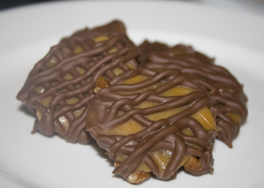 - Place in preheated oven 6-8 minutes, until caramel is softened. Using a buttered spatula, smoosh (technical term) the caramel into the pecans.