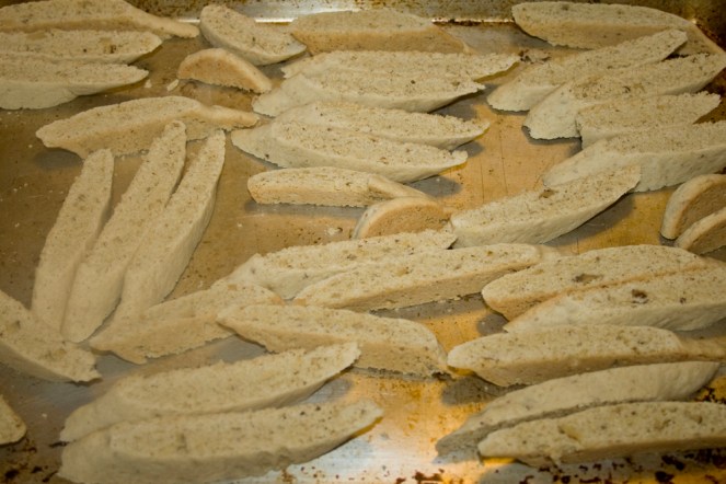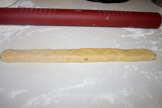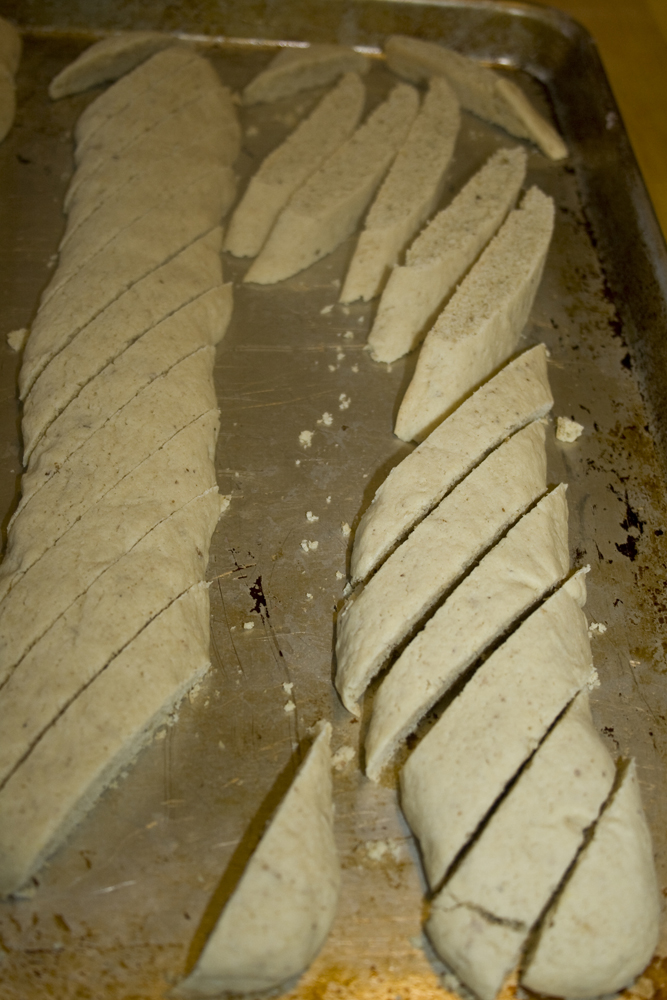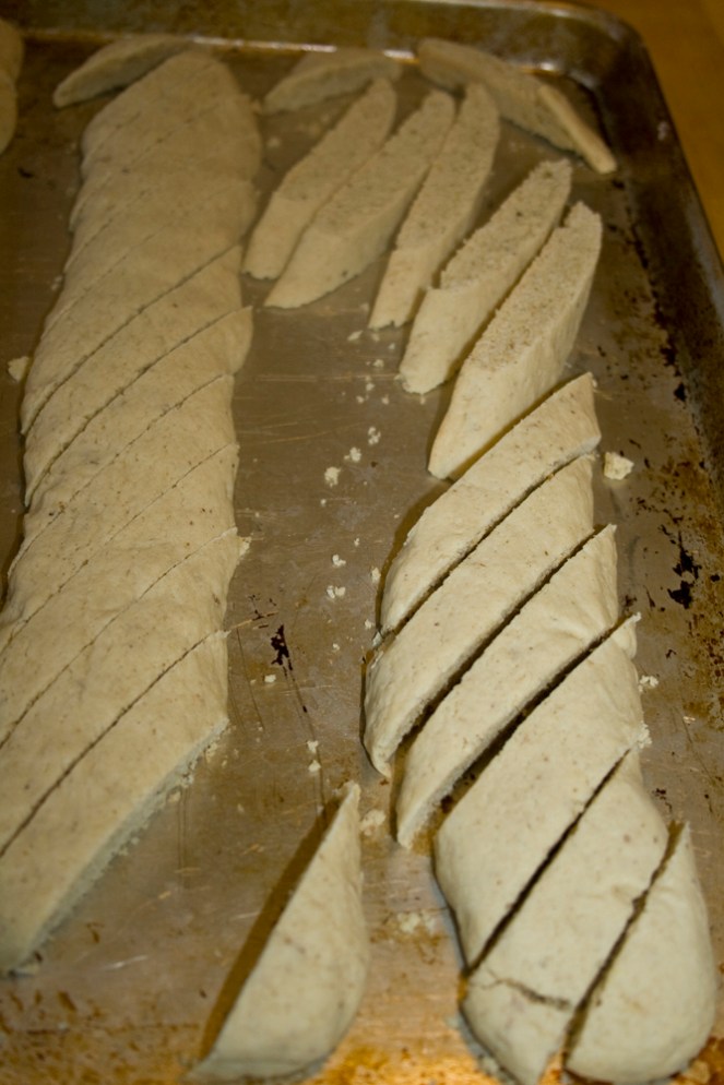 6. Let cool about 2 minutes on pans, then cut each rope diagonally into 1/2 – 3/4 inch thick slices.
