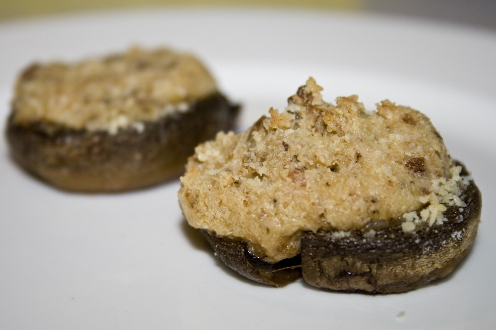 - When garlic and mushroom mixture is no longer hot, stir in cream cheese, Parmesan cheese, breadcrumbs, black pepper, onion powder and cayenne pepper. Mixture should be very thick. Using a ziplock bag filled with the mixture (snip 1 inch off corner), fill each mushroom cap with a generous amount of stuffing. Arrange the mushroom caps on prepared cookie sheet. Top with grated Parmesan cheese.