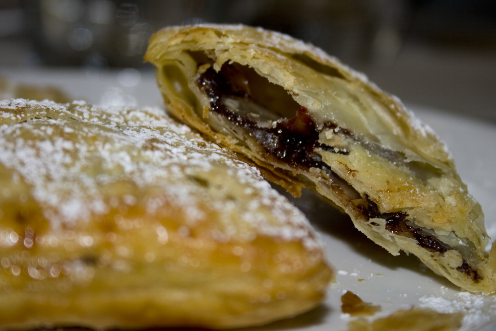 3. Spread some of the chocolate  onto one half of each rectangle to within 1/2 inch of the edge. Spread about 1/2 teaspoon of the raspberry jam over the chocolate. Brush the edges with egg, and fold over the other side to enclose the filling. Press the edges firmly with a fork to seal. Repeat with the remaining rectangles. Use a sharp knife to cut 3 slits across the top of each pastry, and place them on baking sheets, spacing 2 inches apart.