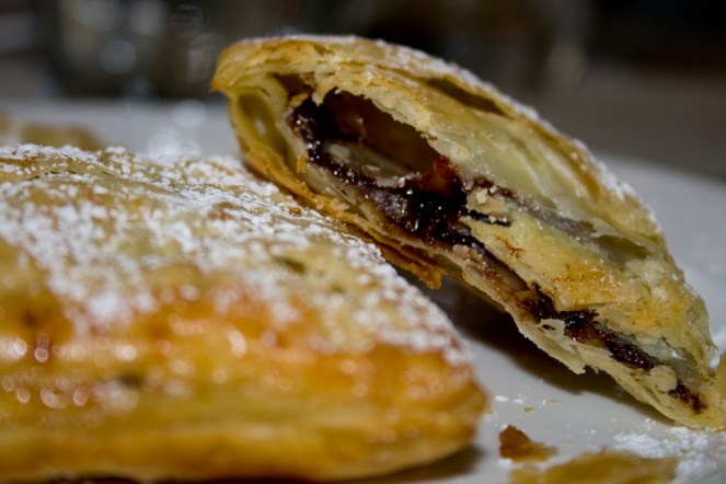 Keep the pastry you aren’t using under a damp paper towel or plastic wrap so it doesn’t dry out. And don’t worry too much about measuring the size of the sheet – just roll it out a little, keeping it mostly rectangular and you’ll be fine. Don’t spend a whole lot of time spreading the chocolate and raspberry perfectly even. Nobody is going to see the inside…it’s all going to bake together in the oven anyway.