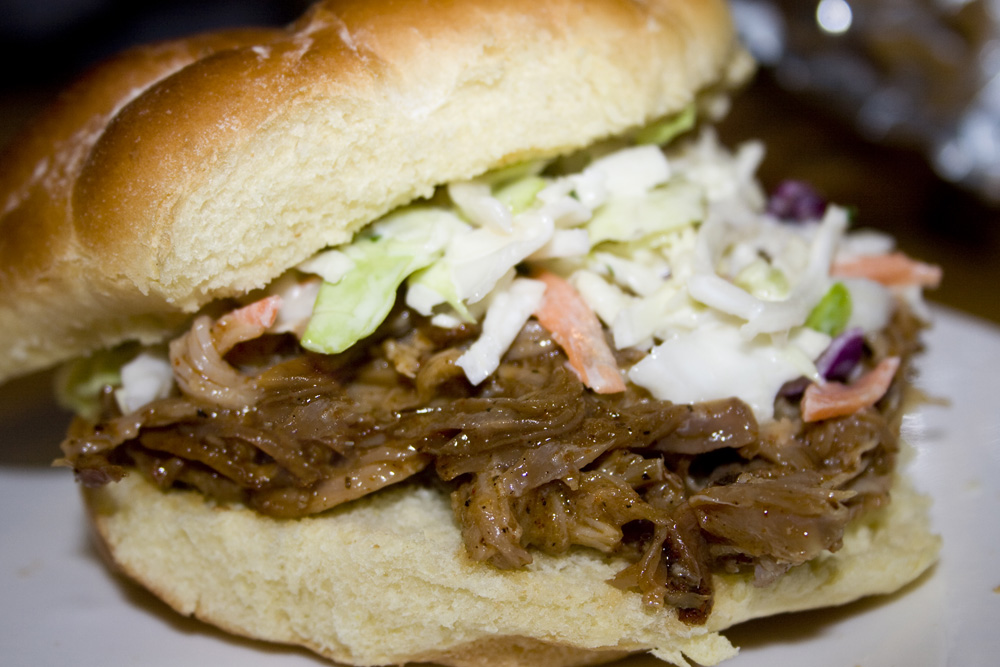 Serve on hamburger buns topped with BBQ sauce and cole slaw.