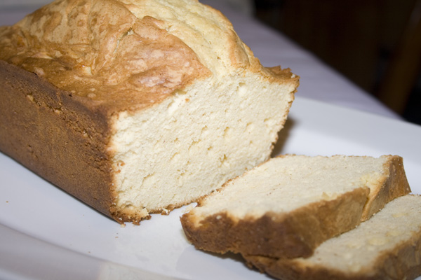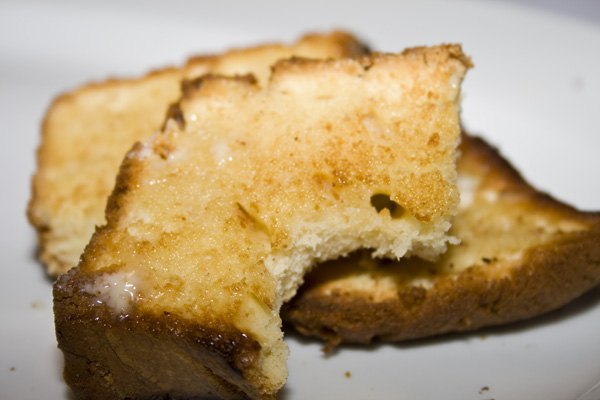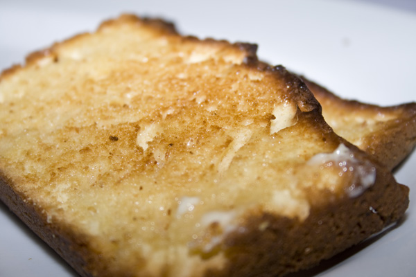 Betty Crocker lends a hand to make this a quick and easy recipe that tastes delicious. However, it does not (as you might expect from the lack of large quantities of butter in the recipe) have the consistency of pound cake. It’s more like a sweetly spiced, eggnog bread. I was mildly disappointed in the texture the first time I made it – probably because what I really wanted as a dense, tastes just like a sweet pound of butter cake. While very yummy, this “cake” just didn’t have that certain stick-to-your-hips quality I was looking for. Then I had an epiphany. I realized that I could slice it and pop it in my toaster. Spread some butter on the golden toasty goodness and voilà. Decadent perfection.