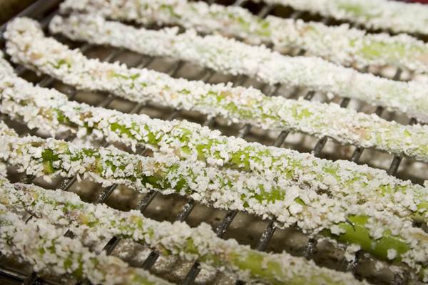 Snap off the tough ends of each asparagus spear. On two separate plates, add the eggs whites (lightly beaten) and the panko + flour + cheese. Season the panko mixture with salt and pepper if desired. Coat each asparagus spear in egg whites, then lay in the panko mixture and thoroughly cover. If the panko won’t stick, dip back in the egg whites and roll in panko once again. Lay each spear on the wire rack.