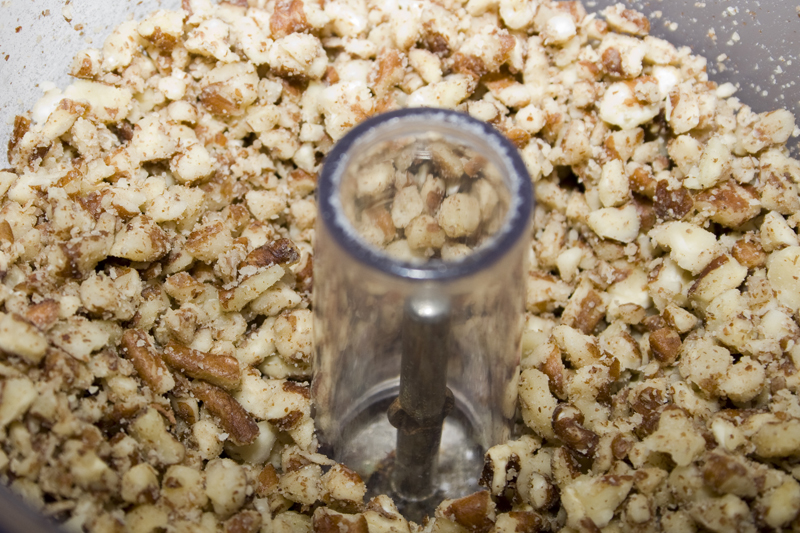 Be sure to chop your pecans fairly finely. I use a mini-food processor (which I love for nuts!). They don’t have to be pulverized completely, but at least as fine as this.