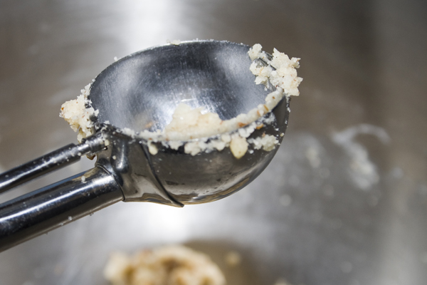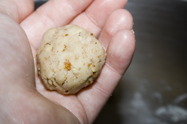 You may notice that there’s no egg in the recipe. This is not a mistake. Because there’s no egg to bind the dough together, room temperature butter is essential. If the butter is even a little cool still, your dough isn’t going to have the stickiness it needs to shape into balls. Even with the correctly warmed butter, your dough will be crumbly. Like wet sand sort of. This is how it should look. Resist the temptation to continue mixing the dough.