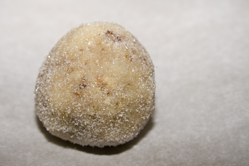 It ended up being exactly the right size – made one dozen precisely. After they’re rolled in sugar they look like pixie dusted dough balls.
