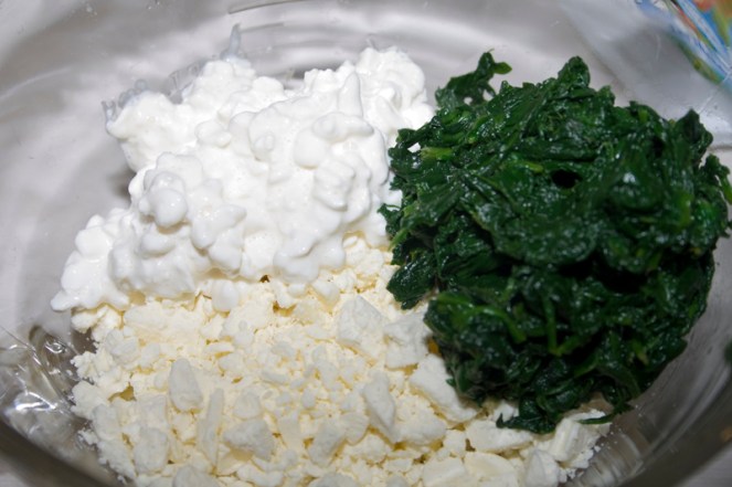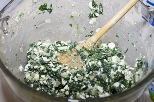 Then combined the drained, chopped spinach, onions and two kinds of cheese. I went with a combo of cottage cheese and feta. Not the traditional ricotta/feta mixture.