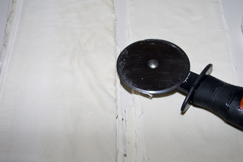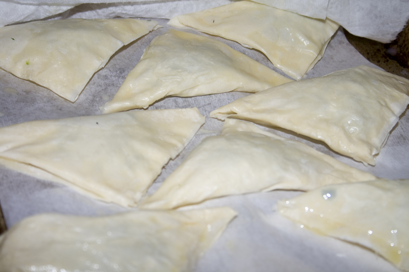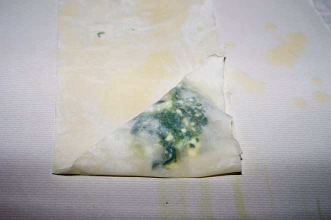 Then came the tricky part. To keep your phyllo dough pliable while you are making up the triangles, you need to keep it covered. Otherwise, it dries out, becomes brittle and just snaps apart when you touch it. I cut my dough into strips with a pizza wheel, stacked it up and draped a couple slightly (very slightly) damp paper towels over it. At this point I also prepped my pan by brushing it with melted butter and got some paper towels ready to drape over the finished triangles as well.