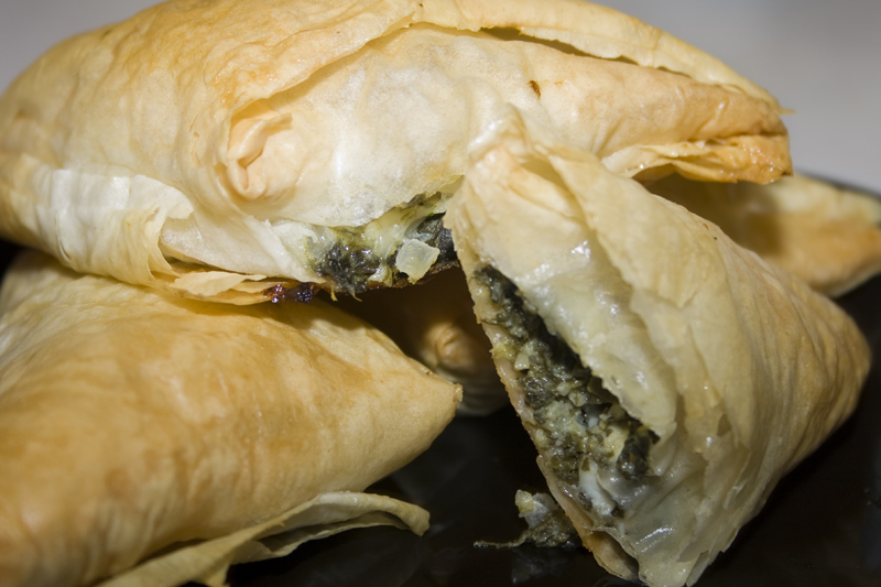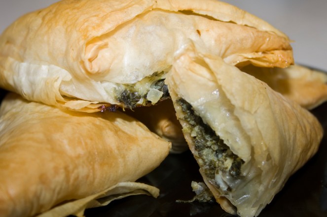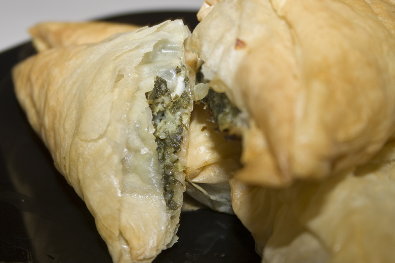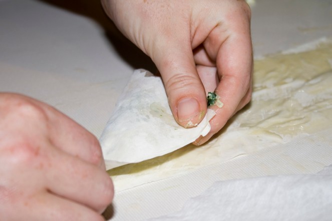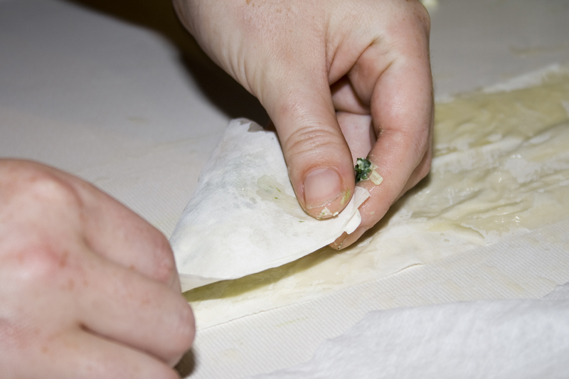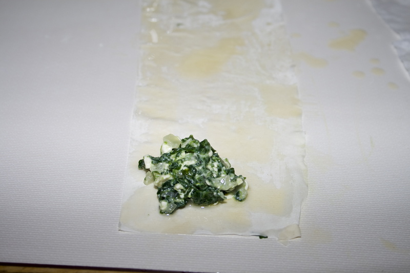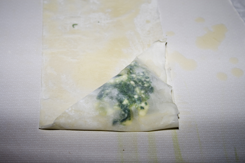 Unroll the filo dough on a flat surface and keep it covered with waxed paper and a damp towel so it doesn’t dry out and become brittle. Using a sharp knife or pizza wheel, cut the filo into 3 by 11 inch strips, and recover with the towel. Use a pastry brush to brush a strip of filo with melted butter. Place another strip on top and brush it with butter as well. Place a small spoonful of spinach filling 1 inch from the end of the pastry. Fold the end over the filling to form a triangle, then continue to fold up the strip in triangles, like folding up a flag. Continue with remaining strips of dough, placing filled triangles on the baking sheet and keeping them covered with a slightly damp paper towel until all are ready to bake.