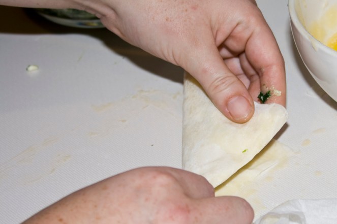 Up into a triangle. (Note: Do you see all the butter on the counter? Product of brushing it all over the dough. Mmmmmm butter.)