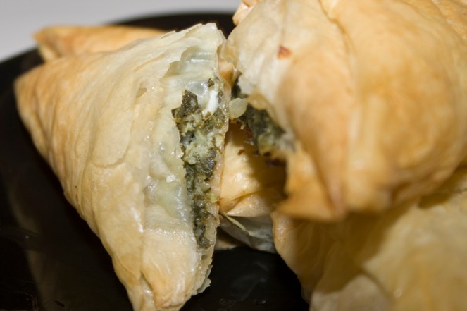 My husband says I move 20% faster than a normal person. He says it’s how I get so much done every day. Also, why I trip over toys constantly and frequently stub my toes on corners, door jams, chair legs, table legs and other people’s feet. Usually I consider my super speed a blessing. Not so much when working with phyllo dough. It is a little tricky, very thin and requires careful methodical preparation. Which is probably why I’ve never used it much. I know my limitations. Slow and steady is most certainly not a strength of mine. For this traditional Greek appetizer, I was willing to give it my best shot. The payoff of flaky, crisp triangles bursting with melty cheesy spinach was totally worth it the effort.
