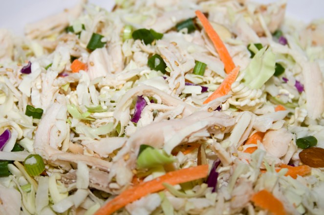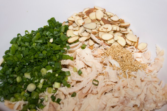 Chop a bunch of green onions and throw in a big bowl with 2 1/2 cups cooked chicken (I always just shred a rotisserie chicken), a handful of toasted sesame seeds and a 1/2 cup of almonds.