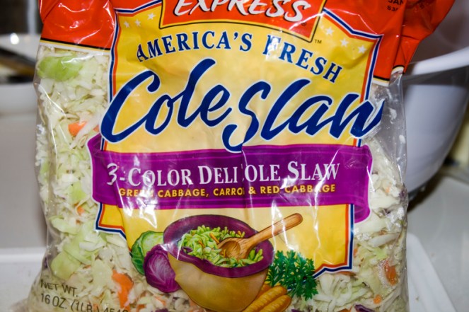 Add one bag of cole slaw mix (or a shredded head of green cabbage) and toss together.