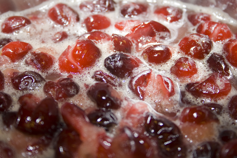 A few minutes later, the cranberries will start popping out of their skins. Or, at least splitting open a little. Once most of them have done their little dance, drain them and set them aside.