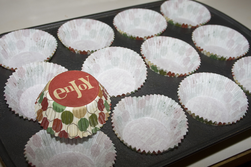 First prepare your pan. Aren’t these cupcake liners cute? I got them from my secret prayer pal. Thanks Sarah! Spray the pan on the top part (where the liners don’t cover) with a non-stick spray before you put the paper liners in. You’ll see why later.