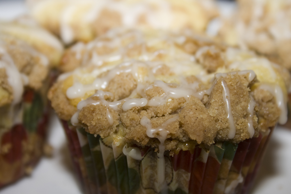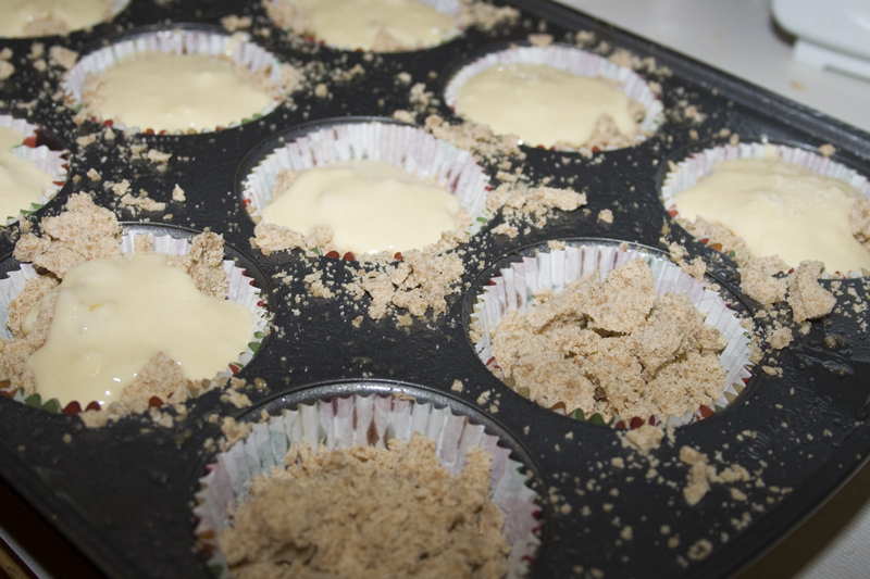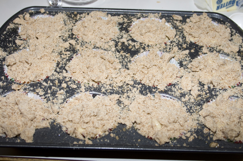 Top with streusel and then another bit of batter. The two closest in this shot have their streusel, the rest already have their top coat of batter.