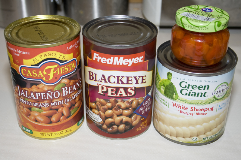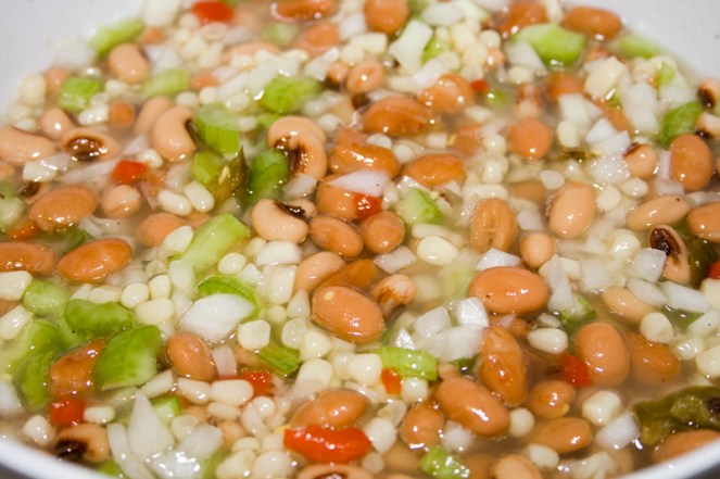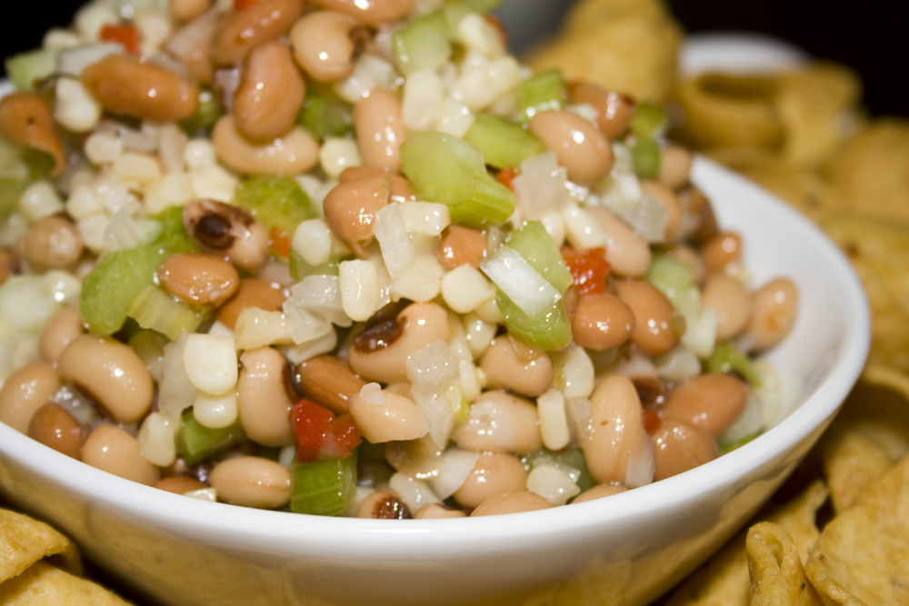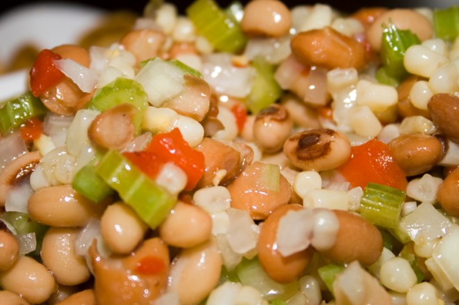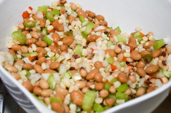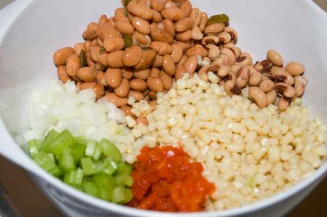 Drain and rinse corn, black-eyed peas and beans. Mix together in a large bowl with the pimentos, bell pepper, onion and celery.