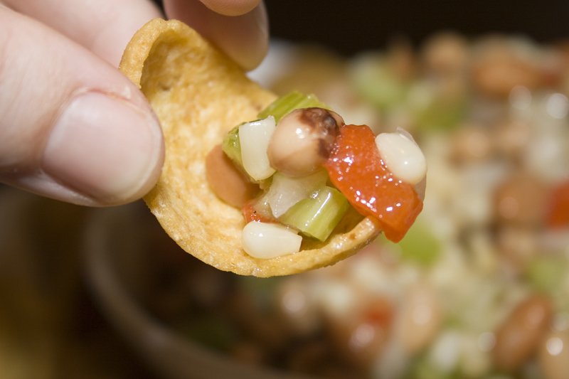 Is there someone in your life who seems perpetually stuck at a certain age? Until recently, I’ve always thought of my baby sister as the age she was when I left home. In my mind she just kind of stopped growing up. Probably because I didn’t see her every day, I got involved in my own life etcetera. Lately however, I’ve realized what an incredibly grown up, level-headed and mature woman she is. She impresses me beyond words. I’m blown away by her strength and integrity. She’s just awesome. A small part of her overall accomplishments in life is the fact that she’s become a wonderful cook. She makes delicious things and hosts great parties. One of the items I always look forward eating at her soirées is this cowboy salsa. I recently requested the recipe from her so I could indulge in it at home as well. It’s packed with delicious veggies, a little kick and tremendously addictive flavor. Oh, and it’s served with Fritos – who doesn’t love those?