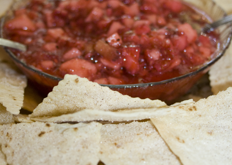 Chop up the apples last when you make this, that way you won’t be cutting up anything else while your apples go brown. I used strawberry preserves (I think) when I served up this salsa. It would be just as good with raspberry or even orange marmalade. Yum.