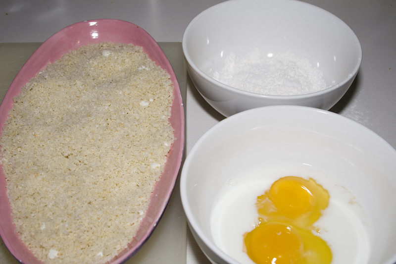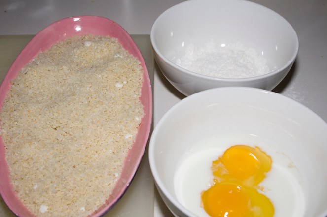 Get three bowls and put flour in one, eggs/milk in another and the panko mixture in the third.