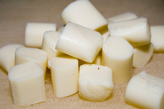 1. Cut each string cheese into four small pieces. Once they get the panko breading on them, they will be a lot bigger.