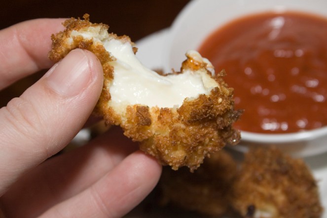I have tried the fried cheese at just about every restaurant in the Seattle area. I love it. In sticks, wedges or balls. With marinara, sprinkled with parmesan, panko, breadcrumbs or beer battered. I would eat it in a box. I would eat it with a fox. I would eat it here or there. I would eat it anywhere.  Hmmmm. Might be reading too much Seuss to my kiddos. Seriously though. Melty cheese in a crunchy shell is absolutely glorious. There’s a fancy pants fried bocconcini (mozzarella balls) recipe floating around on Pinterest, but I figured there had to be an easier way than draining the cheese, patting it dry etc. And I found it in my fridge. String cheese. Genius! Still melty and delicious, without needing a special trip to the store for a $20 bucket of bocconcini.