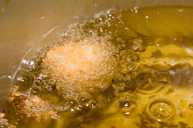 6.  In a large, deep sauté pan over medium-high heat, pour the oil to a depth of 3 inches and heat to 350°F on a deep-frying thermometer. Or, just use your deep fryer if you have one.