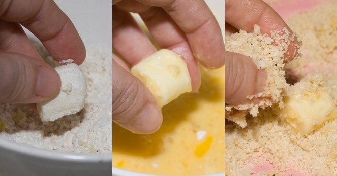 4.  Roll the cheese in the flour, dip into the egg mixture and coat with the panko, shaking off the excess after each step.
