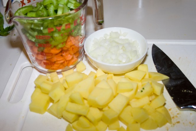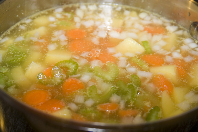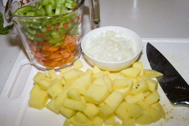 Ok, so we start with some vegetables chopped up. Celery, carrots, onion, potatoes and broccoli. No, your eyes are not playing tricks on you. There is no broccoli in this pic. I forgot about it until I had the other stuff bubbling away in the pot.