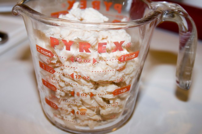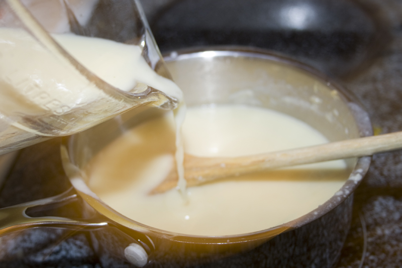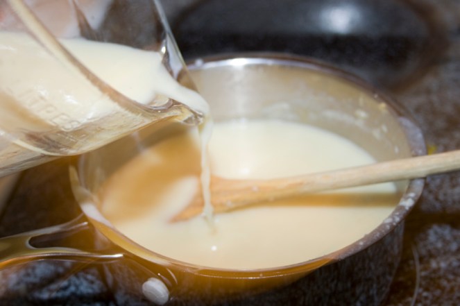 Slowly pour in the reserved broth and some milk. Stir together with the flour until you have a thickened sauce.