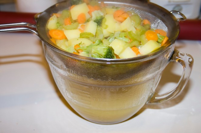 Then we’re going to drain off the liquid. But, we want to keep it for the sauce! So I put a strainer on top of my big measuring bowl, strain out the vegetables and keep the broth. Clever huh? Oh, and finally the broccoli gets some screen time. Hooray!