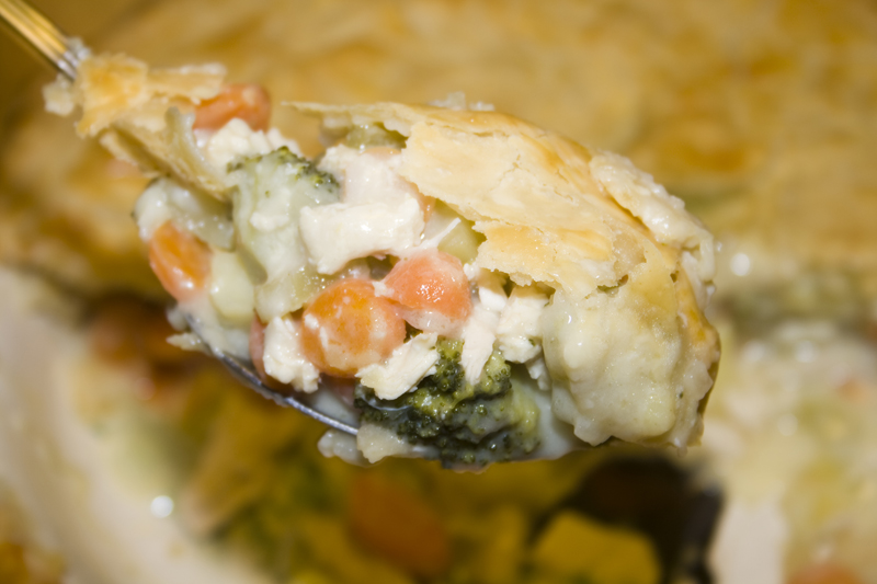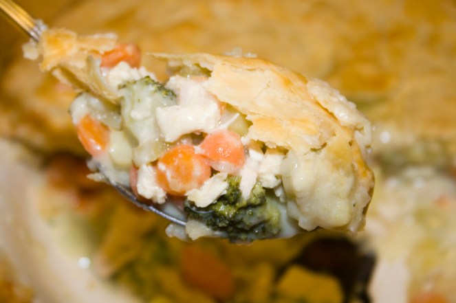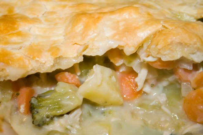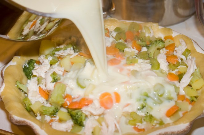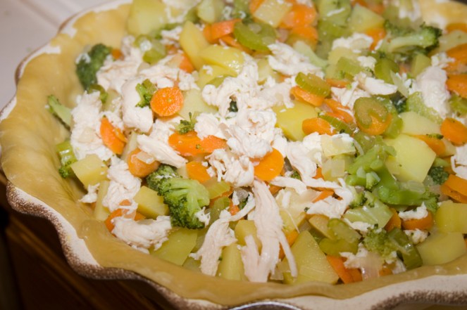 Dump the chicken/veggie mixture into a pre-baked (about 5 minutes) deep dish crust.