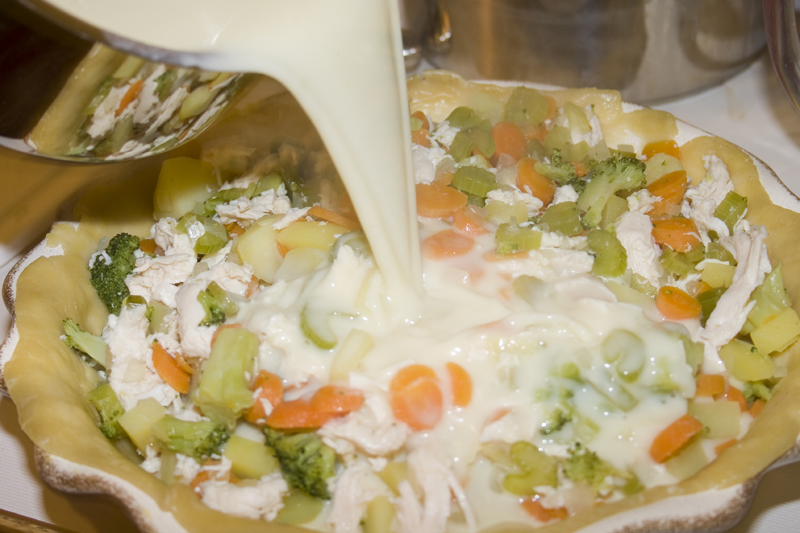 4. Combine the chicken with the veggie mixture and pour into bottom pie crust. Pour hot liquid mixture over. Cover with top crust, seal edges, and cut away excess dough. Make several small slits in the top to allow steam to escape.