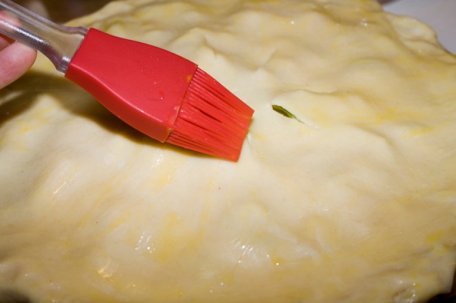 A second pie crust goes on top. Make a couple slits and brush with an egg wash.