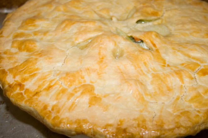 I strongly suggest baking your pie on a rimmed cookie sheet. This pot pie is full to the brim and you don’t want any of that sauce bubbling all over in your oven. It comes out golden and delicious.