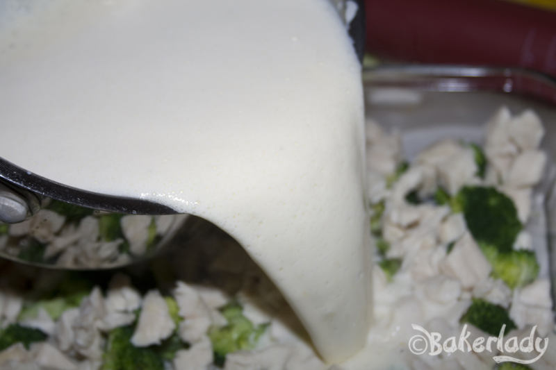Start by layering some cooked chicken with some slightly steamed broccoli in a casserole dish.