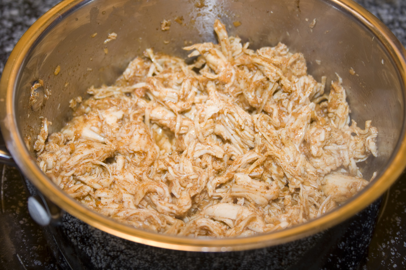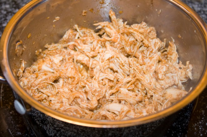 1 1/2 cups cooked, seasoned (with taco seasoning), shredded chicken